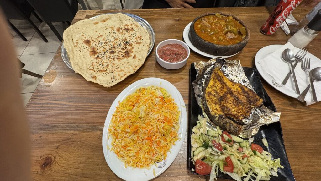 左手前のピラフみたいなやつは、日本のお米と違う品種のようで、普段食べ慣れているお米と違う食感で新鮮で、右上のものはオクラと牛肉が入ったシチューみたいな感じで、左奥にあるナンと一緒に食べるスタイルでした!