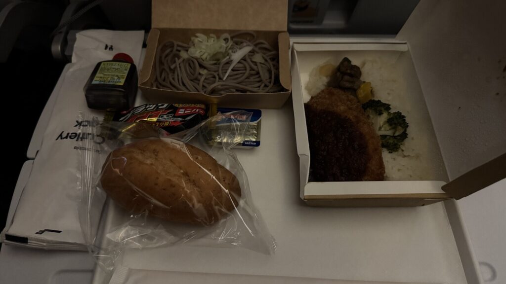 1つ面白かったのは、出発後に出た機内食で、なんとご飯とパンと蕎麦の主食が同時に出るというなかなかインパクトのある組み合わせだったことです笑