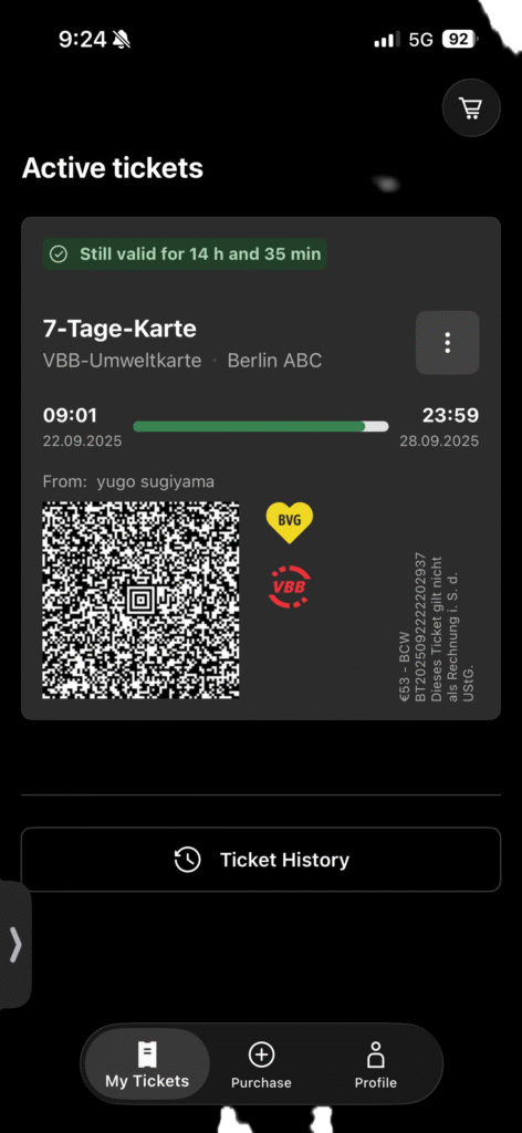 公共交通機関の切符は毎回買うと大変なので、BVGのチケットアプリでオンラインでチケットを買うことができます!